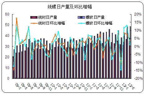 下圖為2009年至2012年全國粗鋼日均產量及環比增幅。從圖上看,繼去年11月份全國粗鋼產量正增長以外,截至到目前已經連續五個月呈現環比上升態勢,并且四月份日均粗鋼產量已經達到201.9萬噸的峰值,遠遠超過了往年。從線材、螺紋鋼產量來看,4月份也繼續增長。其中線材、鋼筋產量分別為1143.2萬噸和1461.6萬噸,日產量分別為38.1萬噸和48.72萬噸,環比上月增幅分別為0.38%和0.89%。雖然本月增幅有所減少,但在基數較大并且連續三個月正增長的前提下,當前線螺產量已經遠遠超過了國內需求(國內線材、螺紋鋼出口均很有限)。