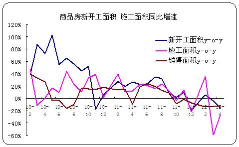 下圖為我國商品房新開工面積、施工面積以及銷售面積同比增速走勢圖,從圖上可以看出,4月份我國商品房同比增速均繼續呈現負值。繼國內一線城市以及省會城市實施限購政策以來,商品房投資可謂一路下滑。不僅對國內消費影響較大,同時也導致開發商對終端鋼材的需求量出現了明顯的回落。尤其是2012年前四個月,銷售面積同比增速一直下滑,并且新開工面積和施工面積也徘徊在零增速附近。