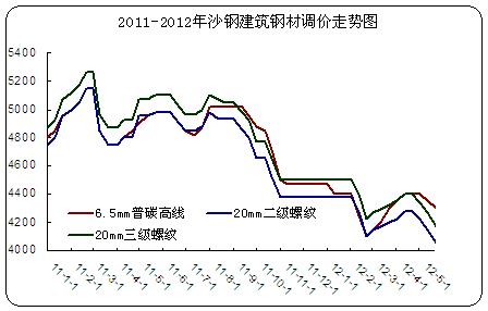 以下是河鋼和沙鋼兩大鋼廠2011年-2012年建筑鋼材政策調整走勢圖。由于本月國內主要市場建筑鋼材現貨價格下滑幅度較大,一線鋼廠雖略有滯后,但整體上均以降價為主,并且降幅要小于現貨市場,也就是說,在鋼廠價格調整之后,主導市場價格仍然倒掛,貿易商也仍處于虧損狀態。尤其是河北鋼鐵集團,在北方市場整體出貨情況不樂觀的情況下,鋼廠甚至出臺相關政策,限制代理商降價幅度,以保證其訂貨價格。但是這樣一來,河鋼與其他鋼廠資源價差逐步增大,不但對于其自身出貨不利,反而增大了貿易商的虧損幅度以及市場資源量的消化,因此在這種情況下,中間商也只能以暗降為主。另外由于國內整體資源去庫存進度較慢,以及后期市場風險猶存,多數大廠代理商訂貨情況均不好。