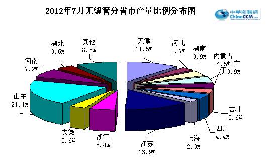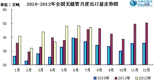 2012年7月份出口無縫管47.09萬噸,比去年同期多出口1.61萬噸,同比增長3.57%。7月份出口量環比6月份減少1.18萬噸,環比下降2.44%。2012年1-7月份累計出口無縫管296.72萬噸,同比增長14.18%。