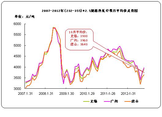 據中華商務網監測數據顯示,2012年10月我國11個主要市場熱軋中寬帶月平均價格3845元/噸,與上月相比漲192元/噸。其中天津、無錫、上海、廣州四個主要市場10月平均價格分別為3750元/噸、3860元/噸、3850元/噸、3920元/噸,分別較上個月漲200元/噸, 130元/噸, 150元/噸和120元/噸。