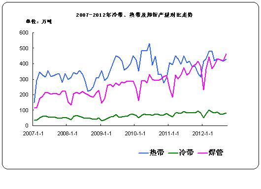 據中華商務網監測數據顯示, 2012年9月份國內熱軋窄帶鋼產量428.6萬噸,環比增產12.4萬噸,日均產量14.29萬噸,日均環比增長6.40%;比去年同期產量378.6萬噸增產50萬噸,同比增長13.21%。2012年9月我國冷軋窄帶產量83.1萬噸,環比增產6.5萬噸,日均產量2.77萬噸;比去年同期產量87萬噸減產3.9萬噸。