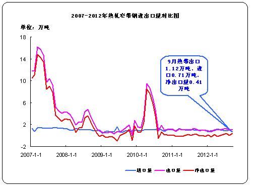 據中華商務網監測數據顯示, 2012年9月份進口熱軋窄帶鋼0.71萬噸,出口1.12萬噸,凈出口0.42萬噸。9月份新增資源量428.18萬噸。