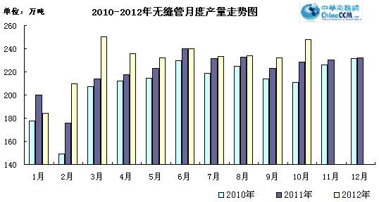 10月份國內生產無縫管248萬噸,同比增長8.6%。環比9月份增產15.6萬噸,環比增長6.71%。2012年1-10月份累計生產無縫管2285.9萬噸,同比增長6.9%。