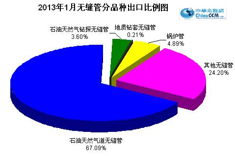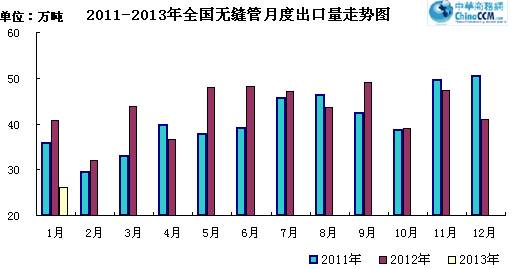 2013年1月份出口無縫管26.15萬噸,比去年同期少出口14.66萬噸,同比下降35.9%。1月份出口環比12月份減少14.92萬噸,環比下降36.33%。(參見:圖三、圖四)