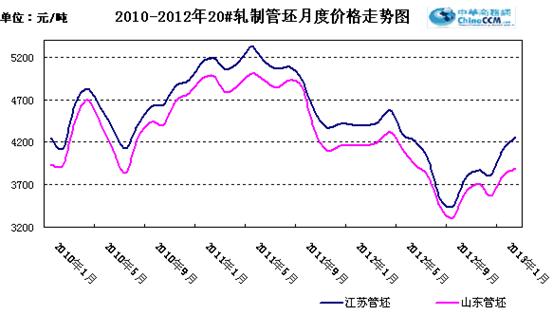 2月江蘇20#軋制管坯月均報價4261元/噸,和上月月均報價相比上漲141元/噸,山東20#軋制管坯報價3892元/噸,比上月月均報價上漲了92元/噸。分時間段來看,年前管坯價格大幅走高,年后盤整運行。作為冶金原料之一的鐵礦石價格漲后小幅下挫,現京唐港進口的63.5%品味的印度粉礦1070-1080元/噸,鐵礦石價格的高企對鋼材價格起到一定的成本支撐。從其下游來看,無縫管市場價格穩中小幅上漲,市場成交低迷,貿易商操作謹慎,管廠成本及庫存的壓力均很大,對管坯價格上漲起到一定的抑制作用。在成本價格的支撐下,短期內管坯價格穩中波動運行的可能性較大。