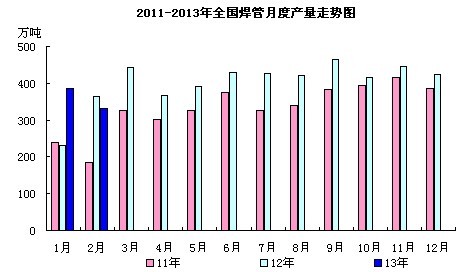 中商網訊:據國家統計局數據顯示,2013年1月份全國分省市焊接鋼管產量387.1萬噸,同比增產155.3萬噸,增幅67%;環比減產37.9萬噸,下降8.92%;日均產值12.49萬噸,創歷年同月新記錄。