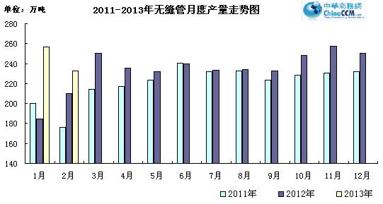 2月份國內無縫管產量232.4萬噸,比去年同期多生產20.4萬噸,同比增長9.6%。環比1月份減產24.6萬噸,環比下降9.57%。2013年1-2月份國內無縫管累計產量489.4萬噸,同比增長22.01%。