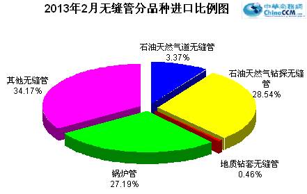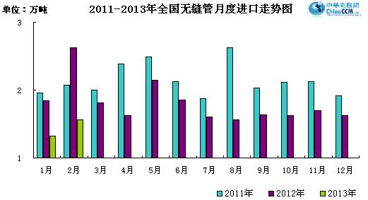 2013年2月份進口無縫管1.56萬噸,比去年同期少進口1.06萬噸,同比下降40.46%。2月份進口環比上月增加0.24萬噸,環比增長18.18%。2013年1-2月份累計進口無縫管3.06萬噸,同比下降31.39%。