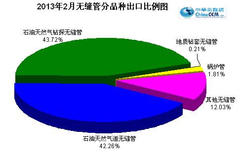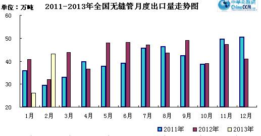2013年2份出口無縫管43.26萬噸,比去年同期多出口11.22萬噸,同比增長35.02%。2月份出口環比1月份減少0.94萬噸,環比降低2.13%。2013年1-2月份累計出口無縫管87.46萬噸,同比增長20.05%。