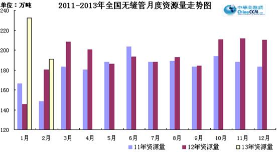 2月份國內無縫管新增資源量190.7萬噸,比去年同期增加10.22萬噸,同比增長5.66%。環比1月份減少23.6萬噸,環比下降11.01%。2013年1-2月份無縫管累計新增資源量405萬噸,同比增長24.27%。