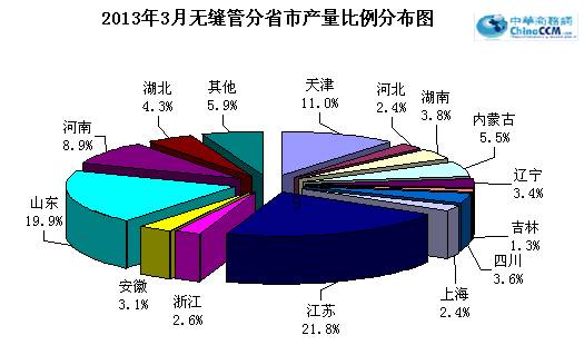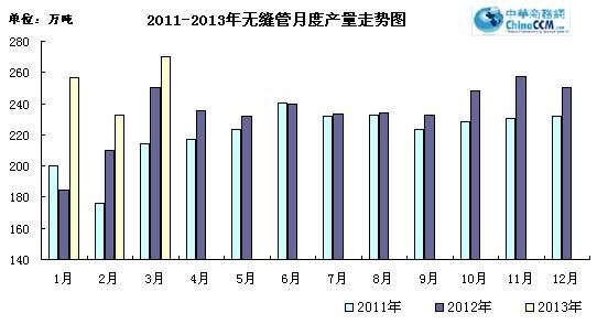 3月份國(guó)內(nèi)無(wú)縫管產(chǎn)量269.8萬(wàn)噸,比去年同期多生產(chǎn)16.6萬(wàn)噸,同比增長(zhǎng)6.6%。環(huán)比2月份增產(chǎn)37.4萬(wàn)噸,環(huán)比增長(zhǎng)16.09%。2013年一季度國(guó)內(nèi)無(wú)縫管累計(jì)產(chǎn)量705.7萬(wàn)噸,同比增長(zhǎng)6.9%。