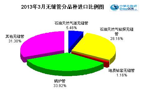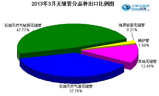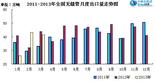 2013年3份出口無(wú)縫管41.53萬(wàn)噸,比去年同期少出口2.27萬(wàn)噸,同比下降5.18%。3月份出口環(huán)比2月份減少1.73萬(wàn)噸,環(huán)比降低4%。2013年一季度累計(jì)出口無(wú)縫管128.99萬(wàn)噸,同比增長(zhǎng)10.39%。