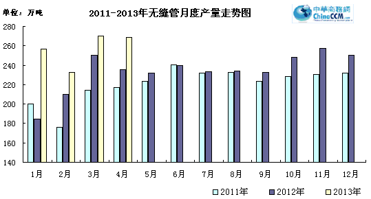 2013年1月到4月無縫管產量累計976萬噸,比去年同期累計增加86.2萬噸,累計增長9.7%。
