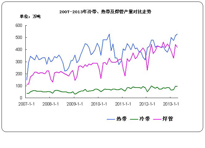 據中華商務網監測數據顯示,2013年4月份國內熱軋窄帶鋼產量529萬噸,環比增產11.8萬噸,環比增長2.28%;日均產量17.63萬噸,日均環比增長5.70%;比去年同期產量481.8萬噸增產47.2萬噸,同比增長9.80%。2013年4月份國內冷軋窄帶鋼產量93.9萬噸,環比減產1.7萬噸。