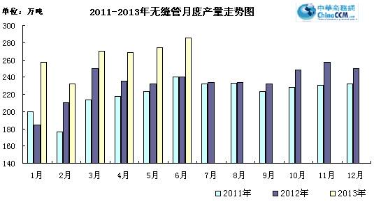 6月份國內無縫管產量285.3萬噸,比去年同期多生產42.5萬噸,同比增長17.5%。環比5月份增產11.1萬噸,環比增長4.05%。2013年上半年國內無縫管累計產量1535.4萬噸,同比增長10.6%。依此估算2013年全年無縫管產量有望突破3000萬噸大關,再創歷史新高。