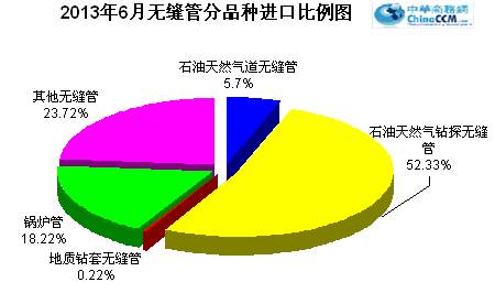 2013年6份出口無縫管42.56萬噸,比去年同期少出口5.71萬噸,同比下降11.8%。6月份出口環比5月份減少4.37萬噸,環比下降9.3%。2013年上半年累計出口無縫管264.48萬噸,同比增長5.96%。(參見:圖五、圖六)