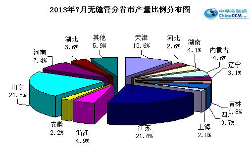 7月份國內無縫管產量258.7萬噸,比去年同期多生產24.7萬噸,同比增長10.6%。環比6月份減產26.6萬噸,環比下降9.32%。2013年1-7月份國內無縫管累計產量1793.2萬噸,同比增長10.8%。