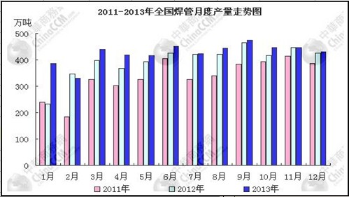 據國家統計數據顯示,2013年11月份我國焊管產量446.8萬噸,同比增長0.29%,環比增幅0.07%。