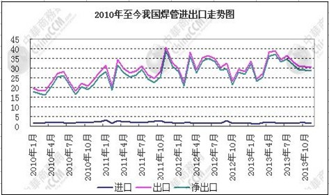 2013年11月份我國焊管凈出口量28.73萬噸,同比增長3.22%,環比下降0.31%。