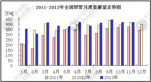 綜上數據所述,2013年11月份我國焊管表觀消費量418.07萬噸,同比增長0.1%,環比增長0.1%。