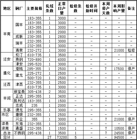 中商網(wǎng)訊:本周唐山21家鋼廠共27條232mm以上帶鋼線,其中22條帶鋼線生產(chǎn)正常,5條檢修,總共影響產(chǎn)量9.45萬噸,開工率81.4%,較上周上升3.7%。