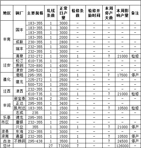 中商網(wǎng)訊:本周唐山21家鋼廠共27條232mm以上帶鋼線,其中20條帶鋼線生產(chǎn)正常,7條檢修或停產(chǎn),總共影響產(chǎn)量12.6萬噸,開工率74%,較上周下降3.7%。