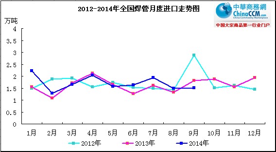 中商網訊:據國家海關統計數據顯示,2014年9月份全國焊管進口總量1.5萬噸,較去年同月減少0.35萬噸,同比下降17.54%;較上月增加0.02萬噸,環比上漲1.28%。前三個季度全國焊管累計進口量15.34萬噸,較去年同期止累計增加1.19萬噸,累計比同期增長8.41%。
