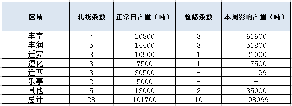 中商網訊: 本周唐山20家232系列帶鋼廠28條帶鋼生產線中,10條帶鋼線檢修或停產,影響產量19.81萬噸,產能利用率為64.27%,較上周持平,18條帶鋼線開工生產,開工率64.29%,較上周持穩。