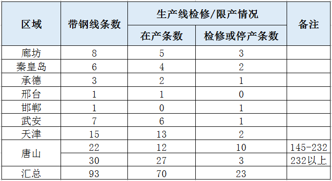 中商網(wǎng)訊:本周京津冀32家長流程帶鋼廠60條帶鋼生產(chǎn)線中,8條檢修或停產(chǎn),影響產(chǎn)量18.79萬噸,產(chǎn)能利用率為86.83%較上周下降1.54%。28家短流程帶鋼廠33條帶鋼線中,14條檢修或停產(chǎn),影響產(chǎn)量19.59萬噸,產(chǎn)能利用率61.29%較上周上升2.1%。