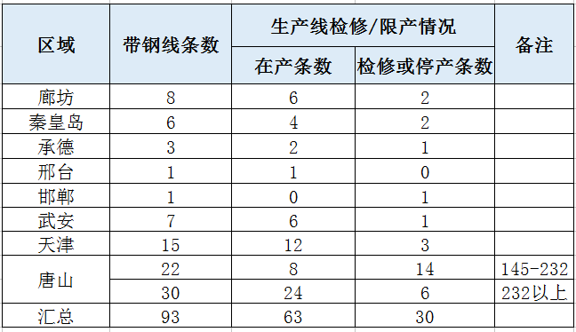 中商網(wǎng)訊:本周京津冀32家長流程帶鋼廠60條帶鋼生產(chǎn)線中,10條檢修或停產(chǎn),影響產(chǎn)量28.25萬噸,產(chǎn)能利用率為80.39%較上周下降4.84%。28家短流程帶鋼廠33條帶鋼線中,15條檢修或停產(chǎn),影響產(chǎn)量30.56萬噸,產(chǎn)能利用率39.62%較上周下降8.24%。