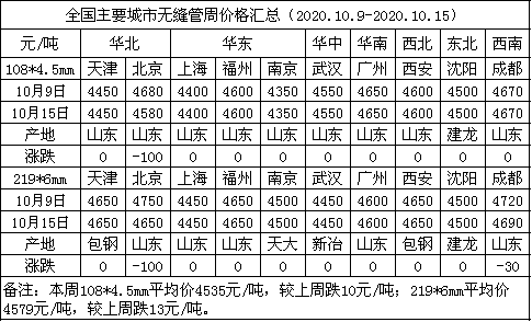 無縫管周價格匯總(2020.9.24-2020.10.9)
