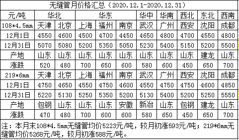無縫管月價格匯總(2020.12.1-2020.12.31)