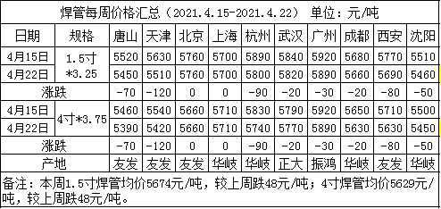 焊管每周價格匯總(2021.4.8-2021.4.15)
