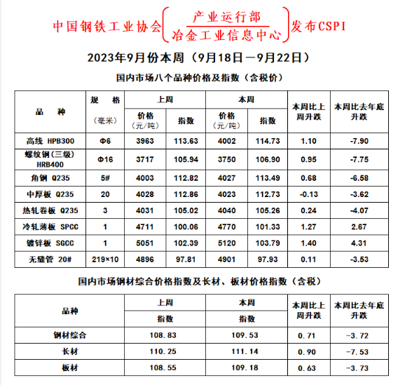 國(guó)內(nèi)主要鋼材價(jià)格指數(shù)(9月4日-9月8日)