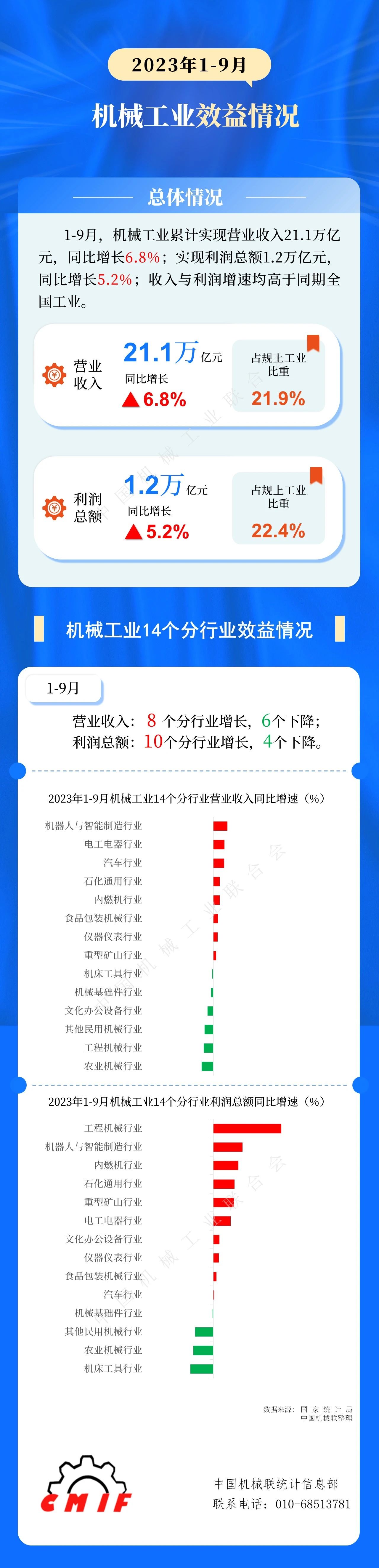 中國機械工業聯合會最新數據顯示,1-9月,機械工業累計實現營業收入21.1萬億元,同比增長6.8%;實現利潤總額1.2萬億元,同比增長5.2%。收入與利潤增速均高于同期全國工業。