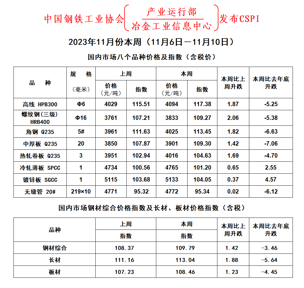 2023年11月份本周(10月30日-11月3日)國內市場八個品種價格及指數