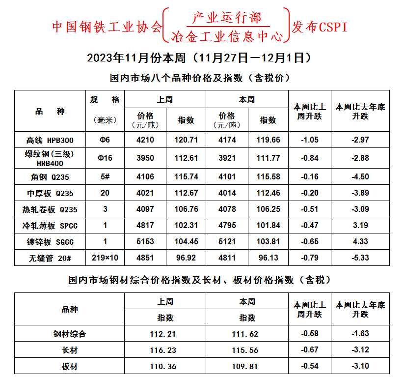 2023年11月份本周(11月13日-11月17日)國內市場八個品種價格及指數