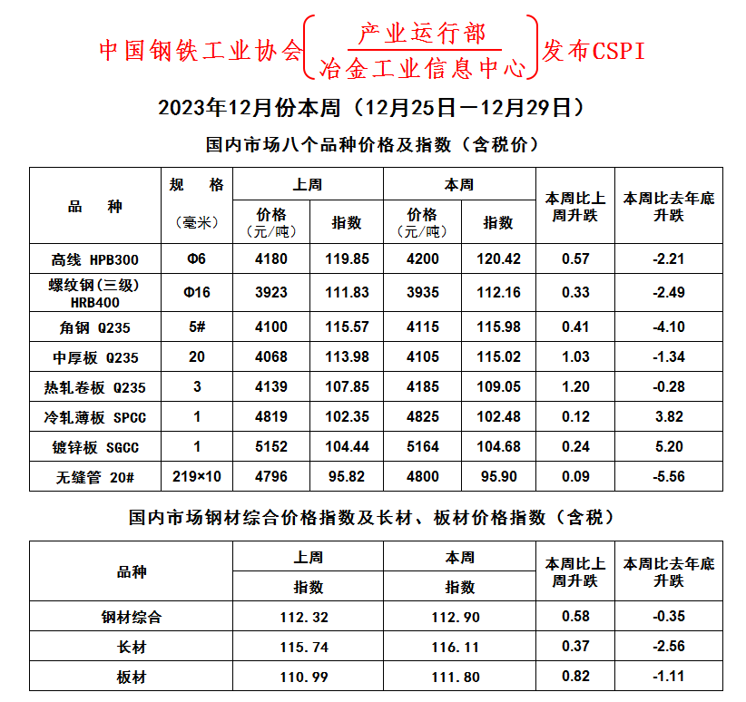 2023年12月份本周(12月11日-12月15日)國內(nèi)市場八個品種價格及指數(shù)