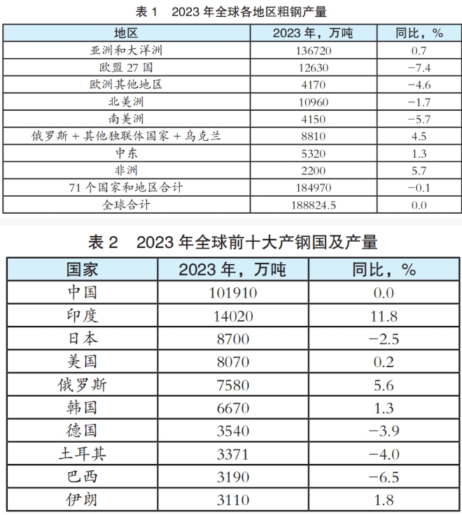 根據世界鋼鐵協會的統計數據,2023年全球粗鋼產量合計18.882億噸,同比基本持平。全球71個納入該機構統計的國家和地區粗鋼產量合計為18.497億噸,同比微降0.1%。分地區來看,歐洲、北美和南美粗鋼產量同比下降,其他地區產量同比增加;分國家來看,全球前十大產鋼國中,日本、德國、土耳其、巴西粗鋼產量同比下降,其他國家同比增加,尤其是印度產量增幅達到11.8%。