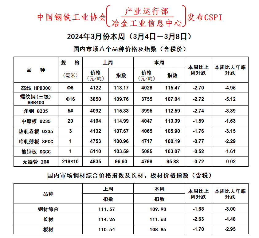 2024年3月份本周(2月26日-3月1日)國內市場八個品種價格及指數