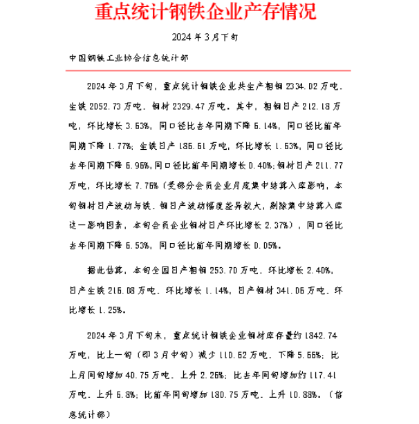 2024年3月下旬重點統計鋼鐵企業產存情況