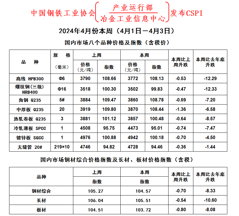 2024年3月份本周(3月25日-3月29日)國內市場八個品種價格及指數