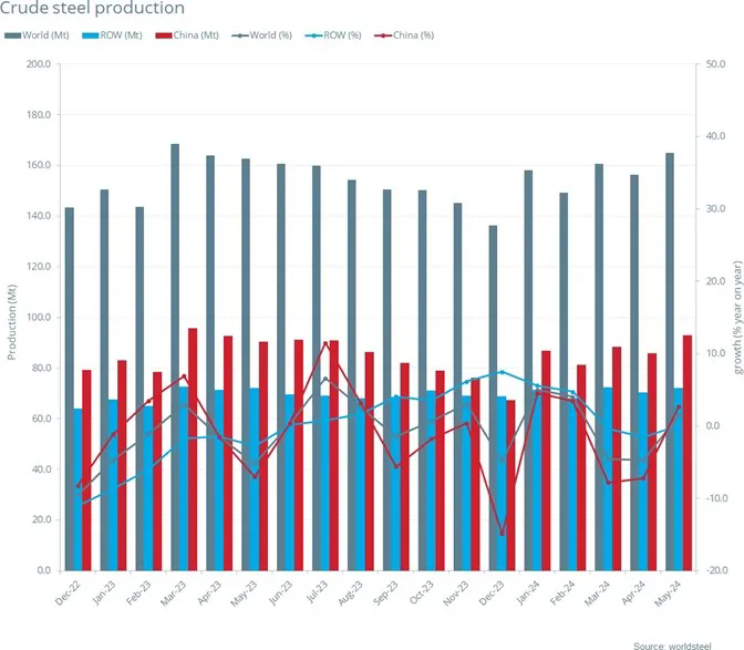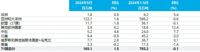 2024年5月全球71個納入世界鋼鐵協會統計國家的粗鋼產量為1.651億噸,同比提高1.5%。