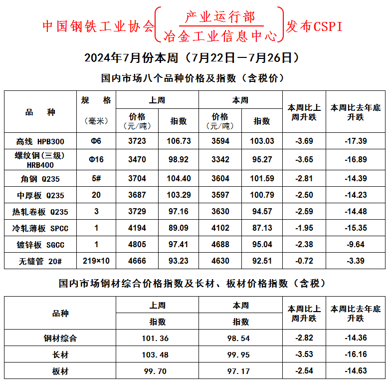 • 2024年7月份本周(7月22日-7月26日)國(guó)內(nèi)市場(chǎng)八個(gè)品種價(jià)格及指數(shù)