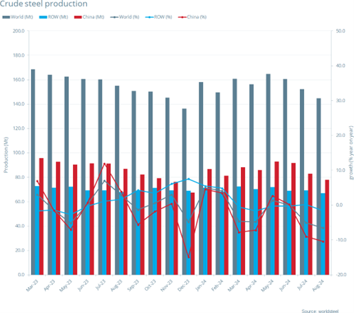 2024年8月全球71個納入世界鋼鐵協會統計國家的粗鋼產量為1.448億噸,同比下降6.5%。