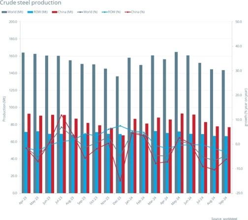 2024年9月全球71個納入世界鋼鐵協會統計國家的粗鋼產量為1.436億噸,同比下降4.7%。
