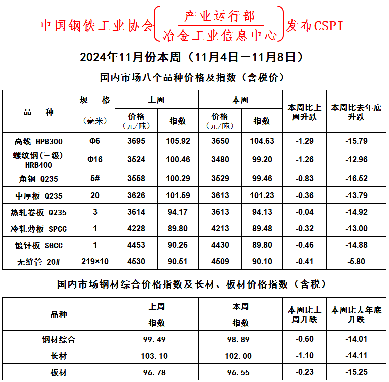 2024年10月份本周(10月8日-10月12日)國內市場八個品種價格及指數