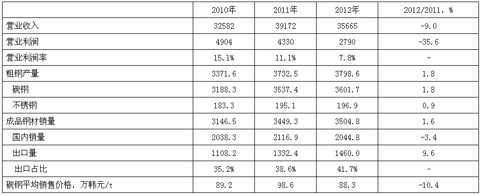 韓國浦項鋼鐵公司2012年粗鋼產量和鋼材銷量均創歷史記錄,而且出口量占銷售總量的比例也較2011年有所上升。然而由于鋼材價格低迷,浦項鋼鐵2012年營業收入和利潤均出現滑坡,營業利潤率也連續2年下滑。制定新年計劃時,浦項鋼鐵預計2013年經濟形勢不佳,因此該公司2013年營業收入和產銷量均較2012年下調。浦項鋼鐵的產能目標是:到2013年底粗鋼年產能達到4700萬t;到2015年進一步提升至4800萬t,其中韓國國內4300萬t,海外500萬t。