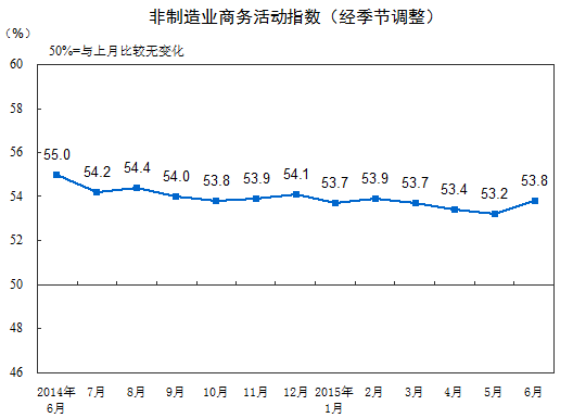 2015年6月份,中國非制造業商務活動指數為53.8%,比上月上升0.6個百分點,繼續高于臨界點,表明我國非制造業總體穩中有進,擴張步伐有所加快。
